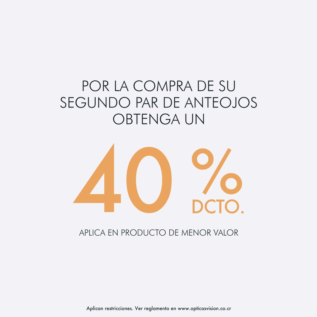 Por la compra de tu segundo par de anteojos de obtenga un 40% de descuento (aplica en producto de menor valor) Del 2 de Enero al 30 de diciembre del 2025 Obténga un 40% de descuento sobre precio normal en la compra de la segunda unidad de anteojos de sol o aro con lentes. Descuento válido para las combinaciones “aro con lentes + aro con lentes”, “aro con lentes + anteojo de sol” . Descuento válido para el producto de menor valor. Descuento no aplica para lentes de contacto, líquidos y/o accesorios. Promoción no acumulable con otras ofertas, convenios o ventas especiales. Promoción válida desde el 2 de Enero al 31 diciembre del 2025 en tiendas y en www.opticasvision.co.cr