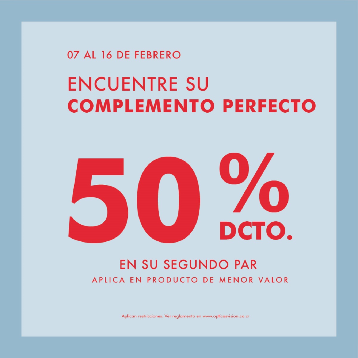 Obtenga un 50% de descuento sobre precio normal en la compra de la segunda unidad de anteojos de sol o aro con lentes. Descuento válido para las combinaciones “aro con lentes + aro con lentes”, “aro con lentes + anteojo de sol y anteojo de sol +anteojo de sol . Descuento válido para el producto de menor valor. Descuento no aplica para lentes de contacto, líquidos y/o accesorios. Promoción no acumulable con otras ofertas, convenios o ventas especiales. Promoción válida desde del 7 al 16 de Febrero del 2025 en tiendas y en www.opticasvision.co.cr