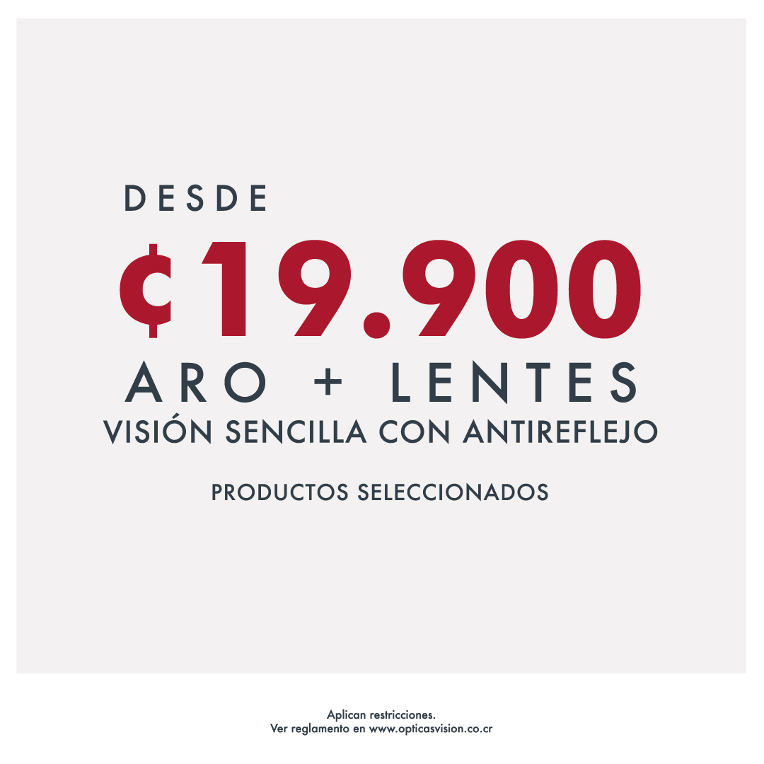 Promoción válida desde el 20 de Enero al 2 de Febrero de 2025. Por la compra de su "aro+ lentes ", obtenga un 20% de descuento en la compra total. Promoción válida sólo para compra "aro + lente". No aplica descuento en lentes de contacto o accesorios. No es acumulable con otras promociones o convenios. . Promoción válida en tiendas ver reglamento en www.opticasvision.co.cr