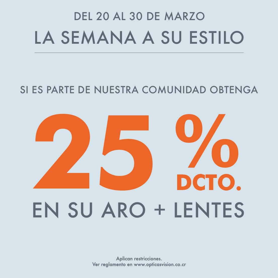 Cupón válido desde el 20 al 30 de marzo de 2025 en sucursales y tienda en línea. Obtenga un 25% de descuento por la compra de aro + lentes . Descuento no aplica para anteojos de sol, lentes de contacto, líquidos y/o accesorios. Descuento no acumulable con otras promociones y/o descuentos. En el Sitio Web solo aplica el descuento para el aro. El Cupón de descuento es intransferible y en caso de ser robado o perdido no será reemplazado por uno nuevo. Para compras presenciales deberás exhibir el Cupón previo al pago. Para compras en el sitio web deberás ingresar el Cupón como Código de descuento en los métodos de pago. ver reglamento en www.opticasvision.co.cr