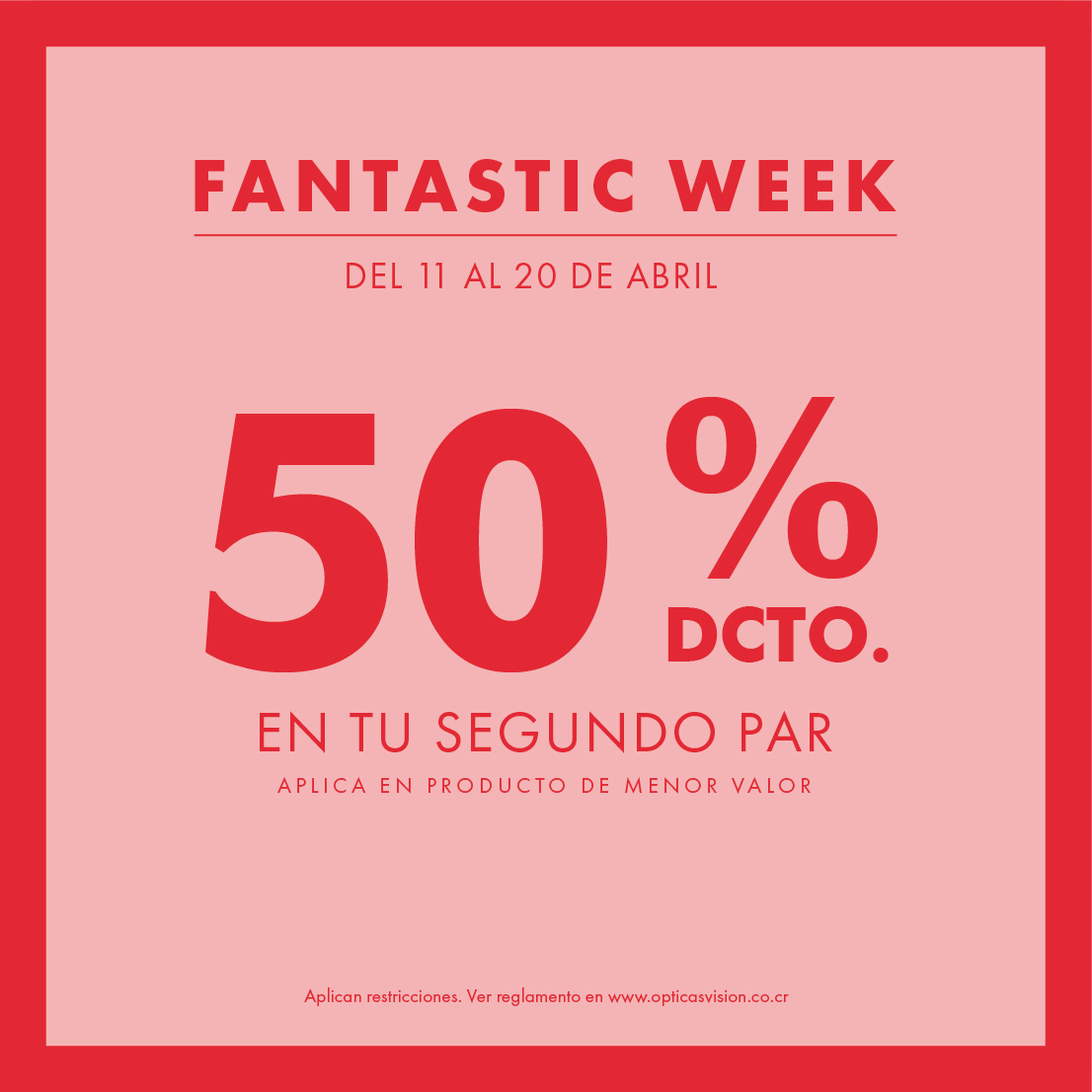 Obtenga un 50% de descuento sobre precio regular en la compra de la segunda unidad “ARO CON LENTES + ANTEOJO DE SOL”, “ARO CON LENTES + ARO CON LENTES”, “ANTEOJOS DE SOL + ANTEOJOS DE SOL”. Descuento válido para producto de menor valor. Descuento no aplica en líquidos y/o accesorios. Descuento no acumulable con otras promociones y/o descuentos. Descuento vigente por 15 días para hacer efectivo el canje del cupón. Promoción válida del 11 de abril al 20 de abril del 2025 en tiendas físicas y www.opticasvision.co.cr
