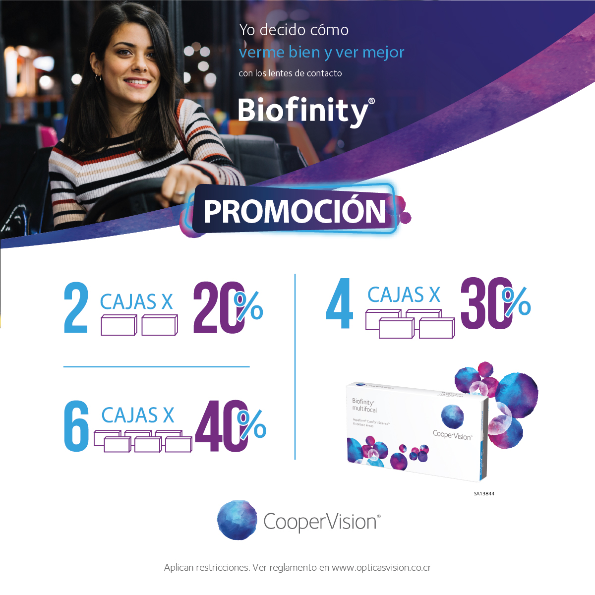 La Promoción consiste en que por la compra de productos Biofinity, Biofinity Torico y Biofinity Multifocal, el cliente recibirá un 20% DE DESCUENTO por la compra de 2 cajas, un 30% DE DESCUENTO por la compra de 4 cajas, y un 40% DE DESCUENTO por la compra de 6 cajas, más información en el reglamento a continuación. Promoción no acumulable con otras ofertas, convenios o ventas especiales. Promoción válida desde el 1 de mayo de 2025 al 30 junio de 2025 en sucursales y en www.opticasvision.co.cr