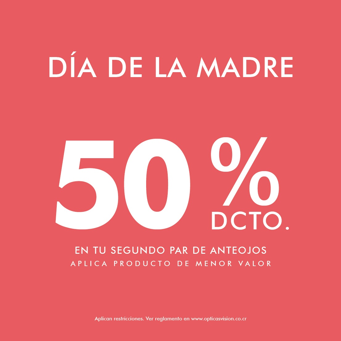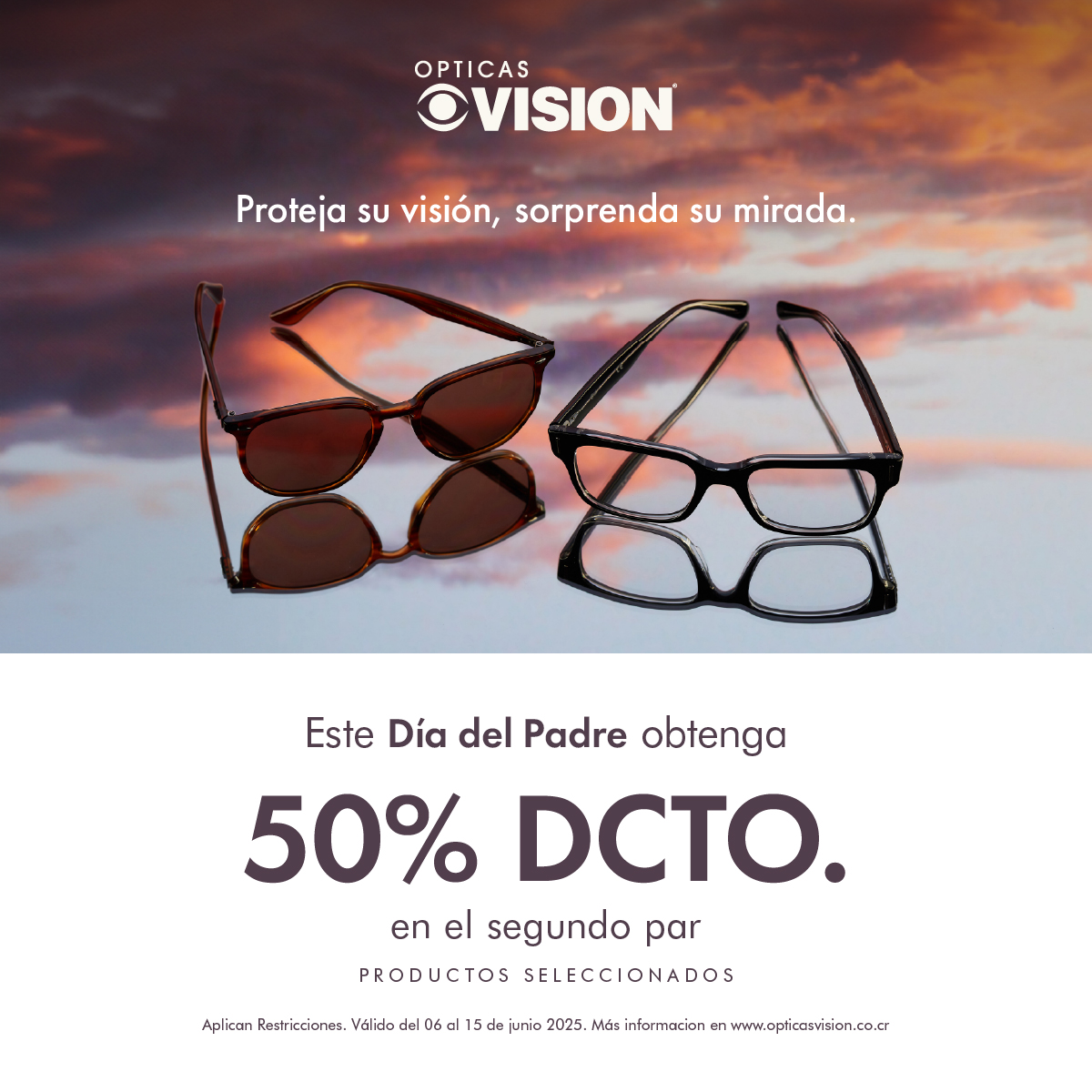 Obtenga un 50% de descuento sobre precio regular en la compra de la segunda unidad “ARO CON LENTES + ANTEOJO DE SOL”, “ARO CON LENTES + ARO CON LENTES”, “ANTEOJOS DE SOL + ANTEOJOS DE SOL”. Descuento válido para producto de menor valor. Descuento no aplica en líquidos y/o accesorios. Descuento vigente por 15 días para hacer efectivo el canje del cupón. Descuento no acumulable con otras promociones y/o descuentos. Promoción válida del 15 al 29 de setiembre de 2025 en tiendas físicas y www.opticasvision.co.cr