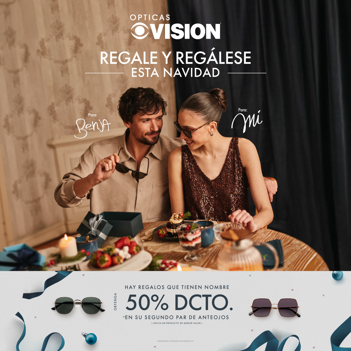 Obtenga hasta un 50% de descuento en tus monturas oftálmicas o gafas de sol seleccionadas. Promoción válida en tiendas Ópticas Visión desde el 08 de diciembre hasta el 31 de diciembre del 2025 y/o hasta agotar existencias. Promoción sujeta a disponibilidad de inventario. Los descuentos aplican sobre precio de etiqueta en monturas oftálmicas y gafas de sol. El descuento no aplica para los lentes oftálmicos a instalar, lentes de contacto, accesorios y/o líquidos. Descuento no acumulable con otras ofertas, cupones, promociones y/o convenios vigentes. En caso de requerirse por parte del cliente devolución de dinero o cambio de producto se realizará sobre el valor efectivamente pagado y bajo previa verificación del producto. Promoción no aplica para las marcas: Prada, Prada Línea Rossa, Persol, ni para las colecciones especiales o ediciones limitadas Ray-Ban Reverse, Ray-Ban Change, Ray-Ban Ferrari. También se excluyen los modelos de la marca a Oakley que pertenecen a la Familia Fisiomorfa: Kato, Encoder, Kaast, Sphera, Subzero.